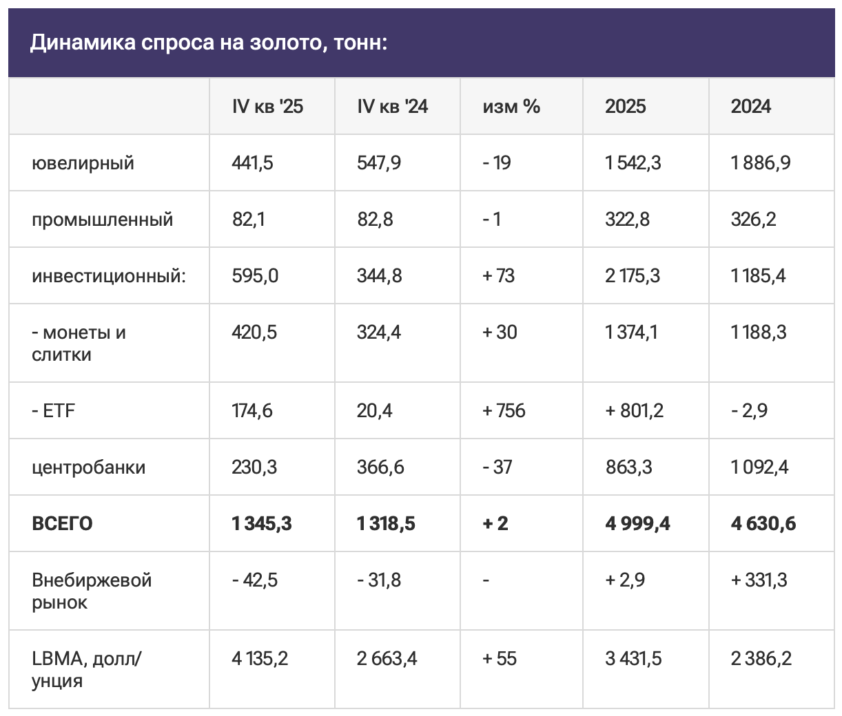 Мировой спрос на золото, включая внебиржевой рынок, в 2025 году впервые в истории превысил 5000 тонн. Благодаря рекордным ралли, в стоимостном выражении спрос составил 555 млрд долларов, что на 45% выше предыдущего года, сообщает World Gold Council (WGC – Всемирный совет по золоту).