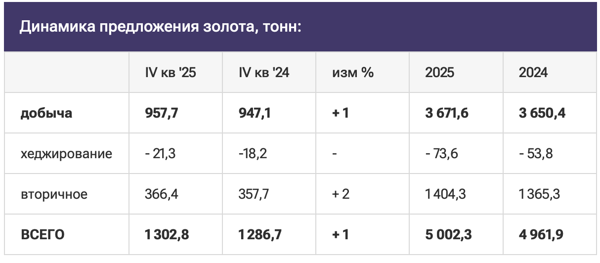 Общий объём предложения золота в 2025 году увеличился до 5002 т, что является самым высоким за всю историю данных WGC с 1970 года, благодаря рекордной добыче и увеличением вторичной переработки.