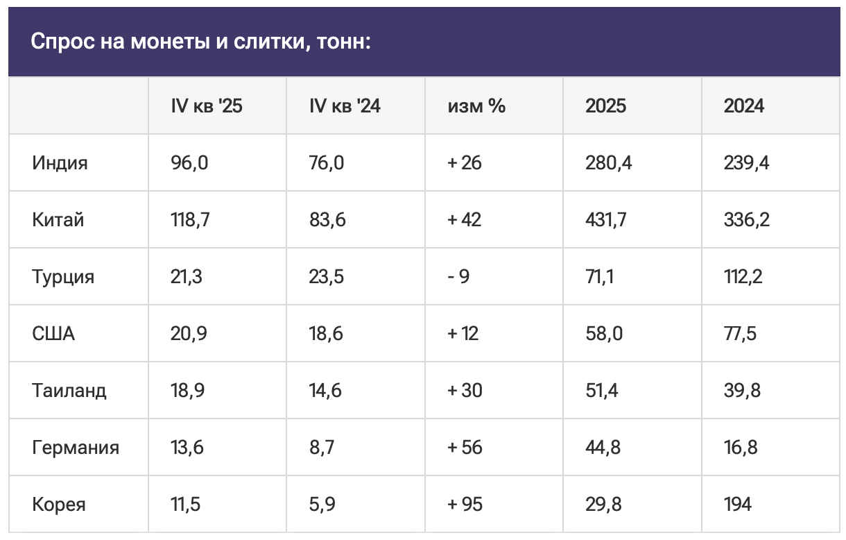 Последний квартал 2025 года стал самым сильным кварталом инвестиций в слитки и монеты за более чем 12 лет. Спрос вырос почти на треть как в годовом, так и в квартальном исчислении. Это привело к самому высокому с 2013 года размеру стоимости в 154 млрд долларов, более половины которой пришлось на Индию и Китай вместе взятые.
